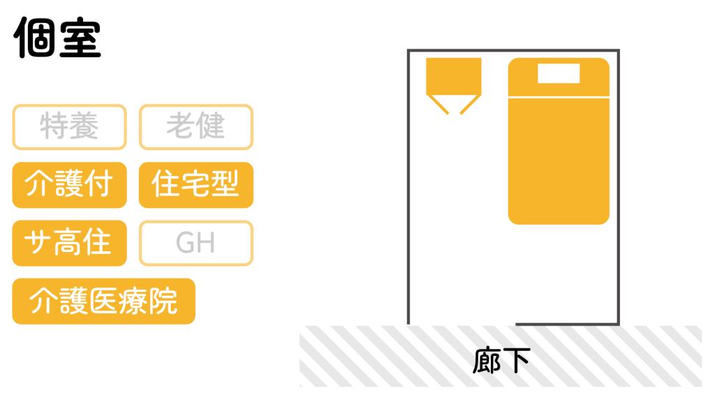 介護度が軽度~重度の方まで幅広く入居が可能な民間施設です。自立度の高い方向けでレクリエーションやイベントを充実させている施設もありますが、現状の多くは要介護者向け住宅として提供しています。住まいの提供と介護の自由な選択が特徴で様々なサービスを組み合わせて選ぶことができます。元々はマンションや単身寮などを住宅型有料老人ホームとして提供している施設もある為、段差や階段等、バリアフリー対応していないと施設もあります。
