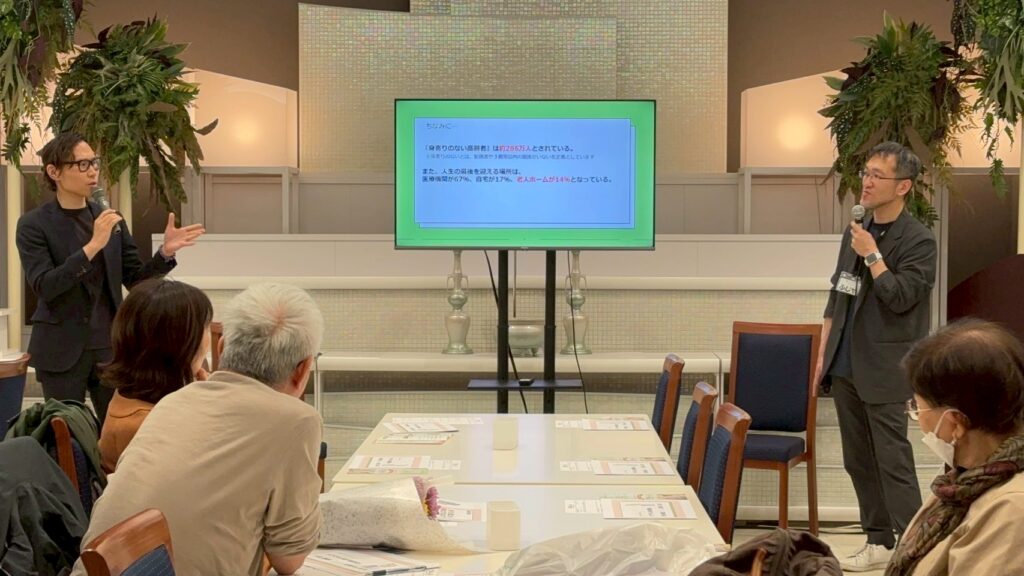 前回に引き続きあんしるの介護セミナーポスターに参加しました。講師はケアマネジャーの藤谷さんと紹介相談員の佐々木さんです。前回と同じく1時間のセミナーで参加費や予約は不要で、当日ふらっと途中からでも参加できるセミナーで気軽な感じが参加へのハードル低く良いなと思いました。フリーマーケットのイベントの催しの一つにあるので、お部屋は別なので回りが気になることは無かったです。