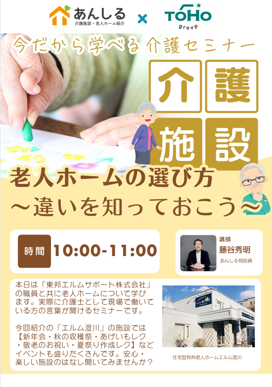 今回は、「東邦エルムサポート株式会社」様が運営する【住宅型有料老人ホーム エルム澄川】の職員の方をお招きし、老人ホームの仕組みや現場での実際の様子について学べるセミナーを開催いたします。