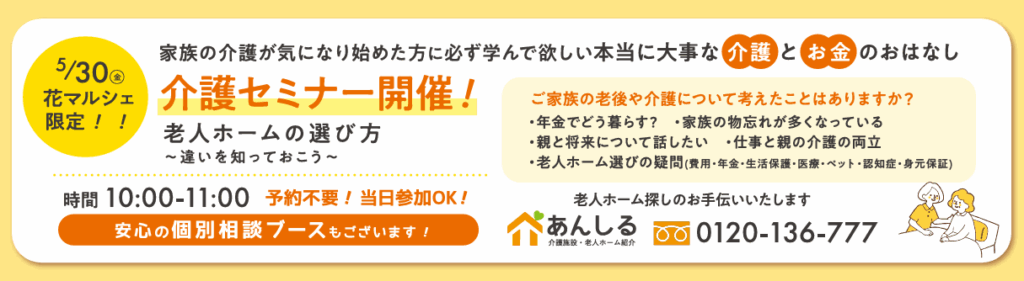 2025/5/30(金)『老人ホームの選び方~違いを知っておこう~』会場:フリエホールつきさむ(花マルシェ)