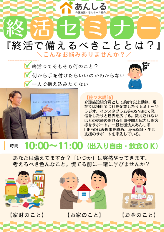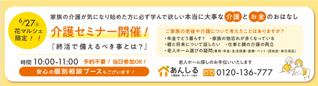 2025/6/27(金)『終活で備えるべきこととは?』会場:フリエホールつきさむ(花マルシェ) 2025.06.16 イベント情報 セミナー情報 重要なお知らせ 🌸6月の花マルシェ介護セミナーのご案内🌸 今回は佐々木講師によるセミナーです。第三の人生の歩み方、終活に関するセミナーです。お金のこと、お家のこと、家族のこと、考えることは沢山あると思います。何からはじめるのか、そもそも何をしたらいいのかなどこれを機に一緒に学びませんか? 参加費は無料・事前予約も不要です。どなたでもお気軽にお越しください。皆様のご参加を心よりお待ちしております。 URL Copied!