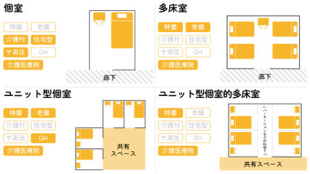 多床室は、複数の方と共同で過ごす部屋で、ユニット型は個室・多床室があります。