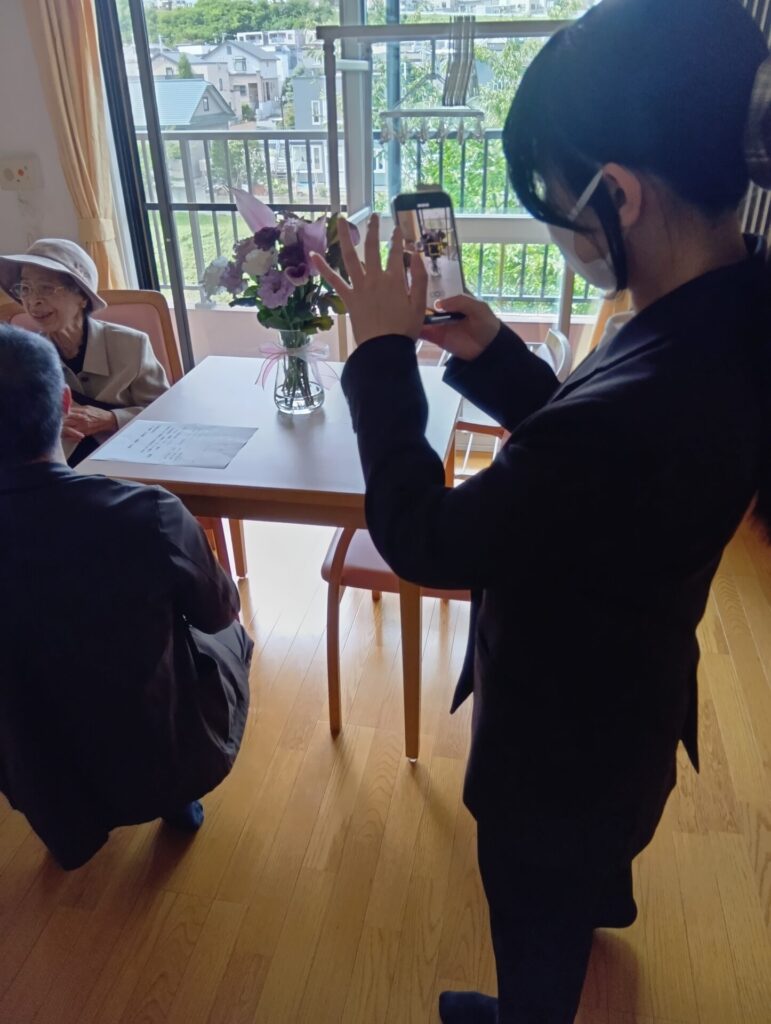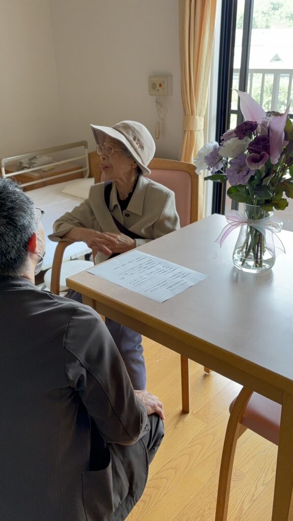 いざお渡し。はじめは何のことだろうと不思議な表情でしたが、受け入れて頂きお花も飾ってくれました。💐🎀